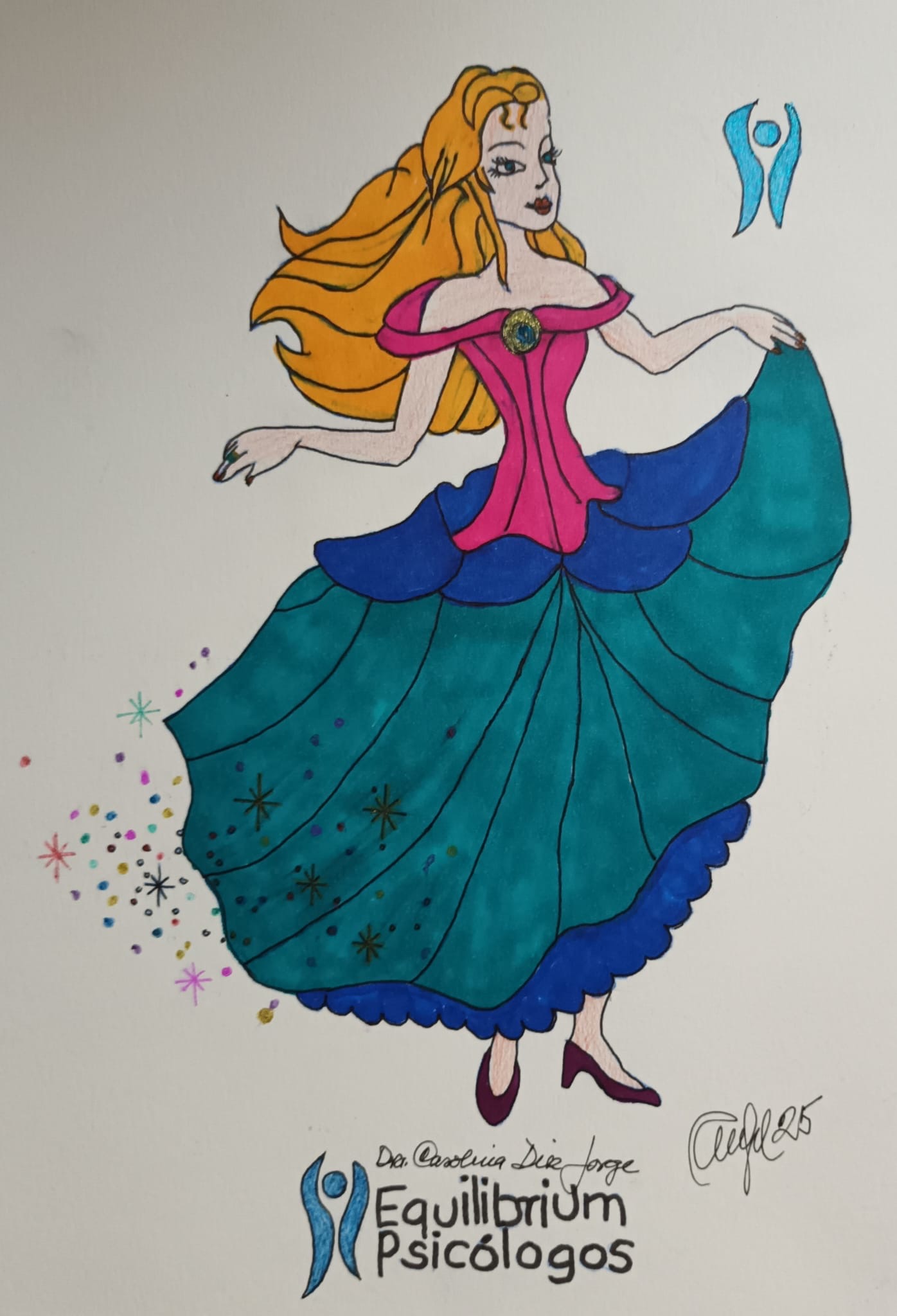 Dibujo de una mujer embarazada tocándose la tirita, con un fondo de océano en tonos pastel y rosas, logo Equilibrium Psicologos y Dr Carolina Diez
