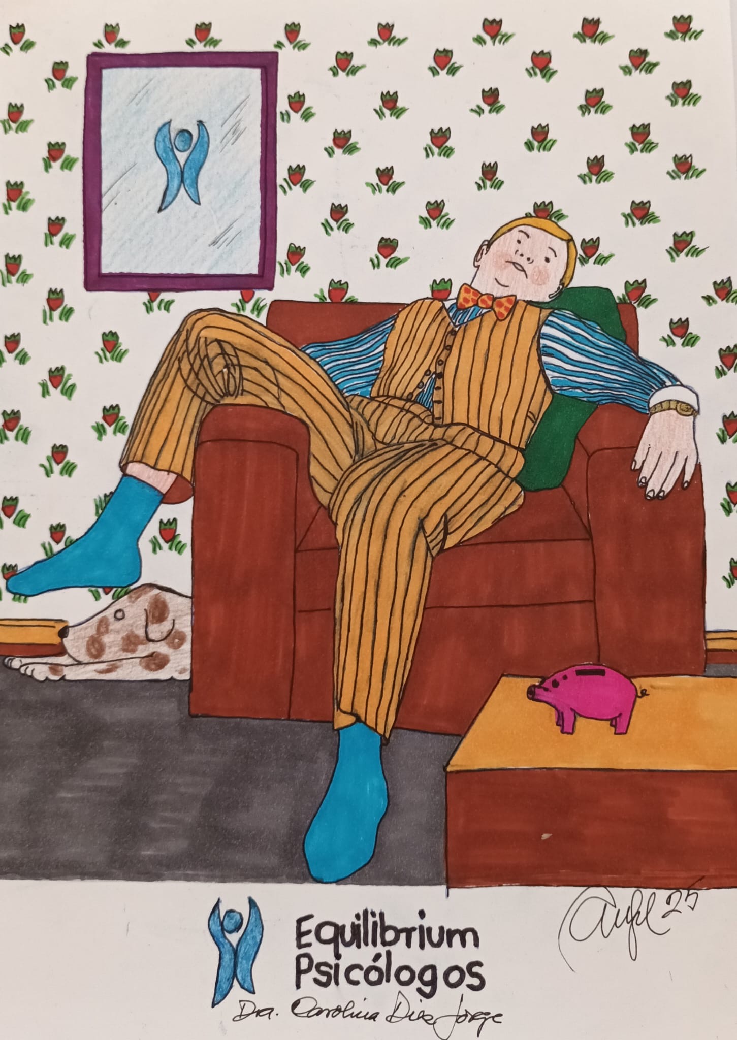 Hombre de dibujos durmiendo plácidamente en su sillón con el logo de equilibrium psicólogos. Mucho colorido en la imagen