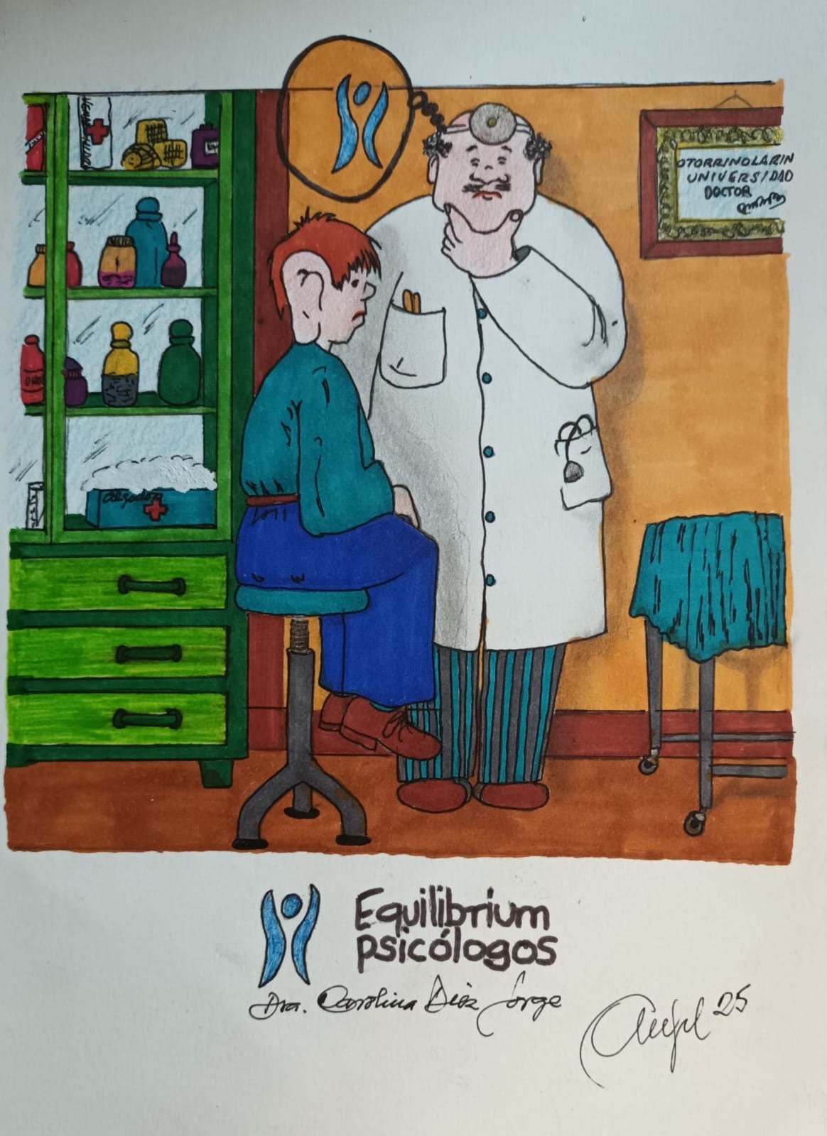 Dibujo de una mano sujetando una probeta con un liquido verde y dentro el logo de Equilibrium Psicólogos