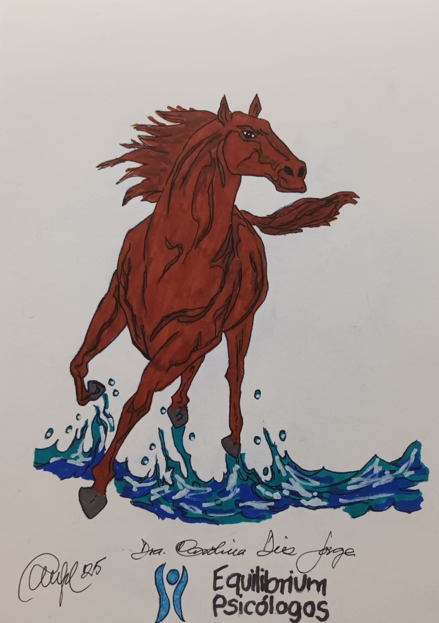 Dibujo de una mujer embarazada tocándose la tirita, con un fondo de océano en tonos pastel y rosas, logo Equilibrium Psicologos y Dr Carolina Diez