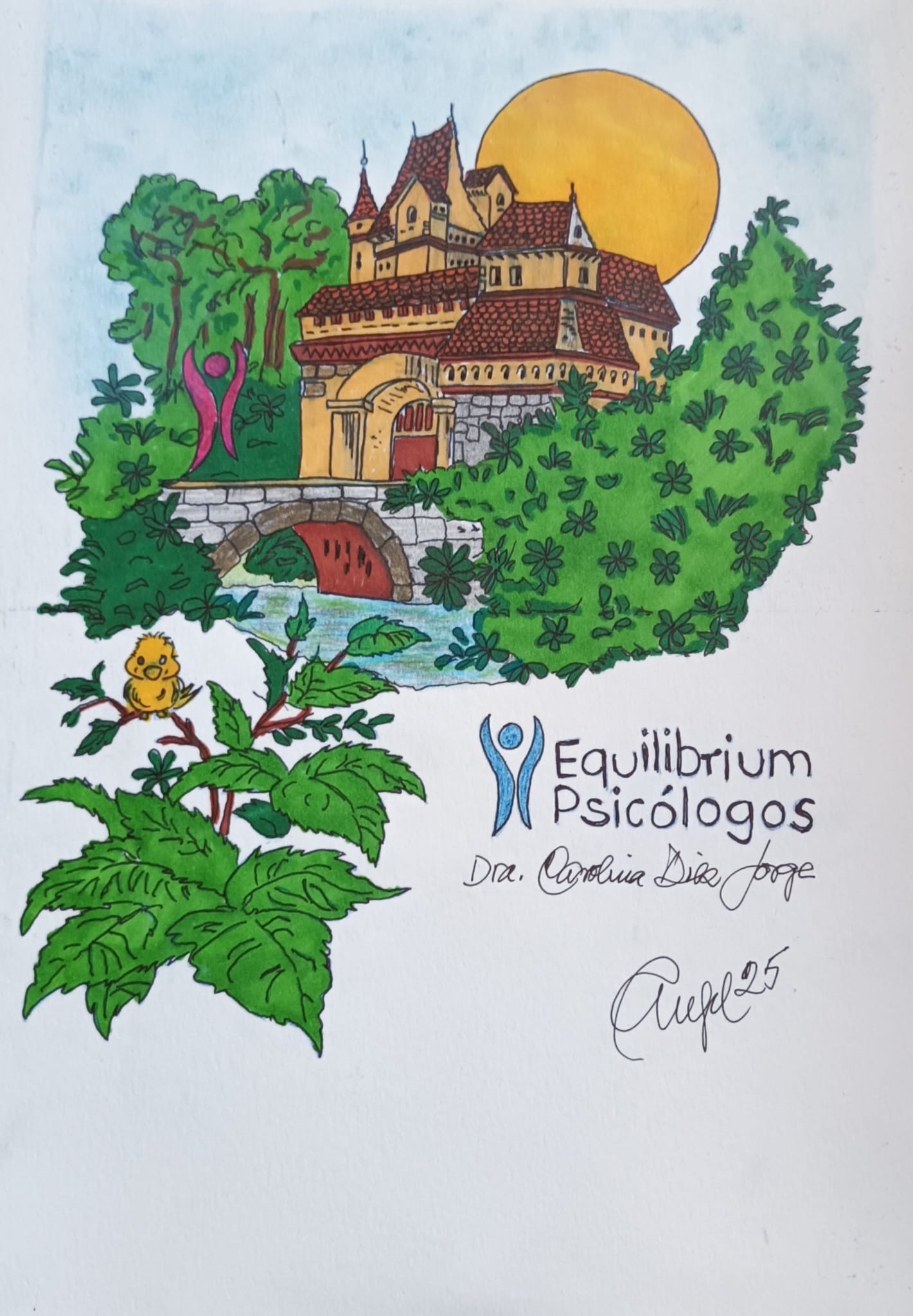 Dibujo de una mujer embarazada tocándose la tirita, con un fondo de océano en tonos pastel y rosas, logo Equilibrium Psicologos y Dr Carolina Diez