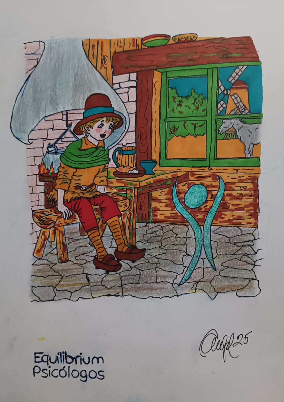 Dibujo de un libro de canto por el que caminan unos personajes felices. En una parte del libro, aparece un hueco con una piece de puzzle en una mano , dispuesta a ser colocada como pieza que falta. Todo con mucho color y logo de Equilibrum Psicólogos
