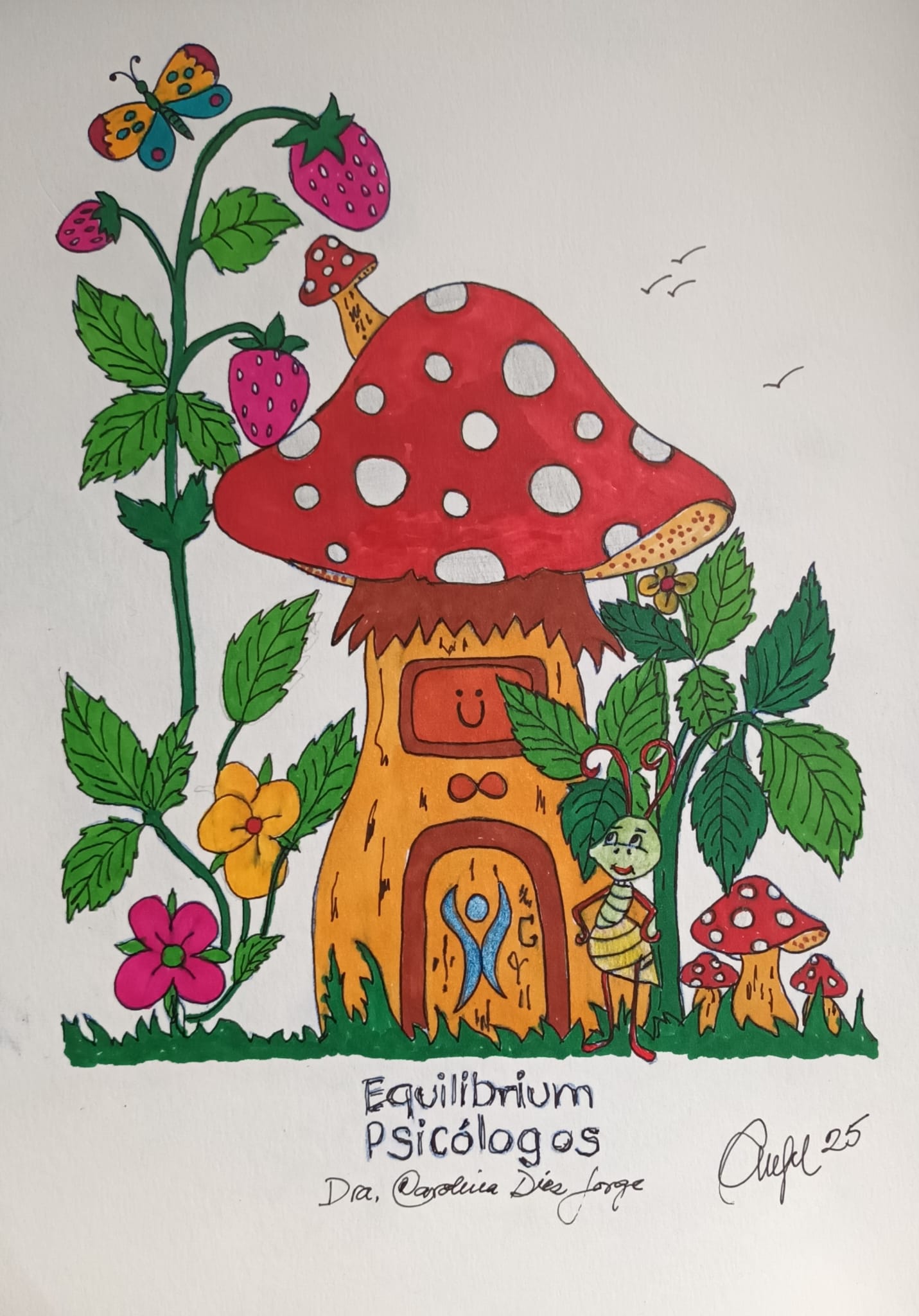 Dibujo de un libro de canto por el que caminan unos personajes felices. En una parte del libro, aparece un hueco con una piece de puzzle en una mano , dispuesta a ser colocada como pieza que falta. Todo con mucho color y logo de Equilibrum Psicólogos